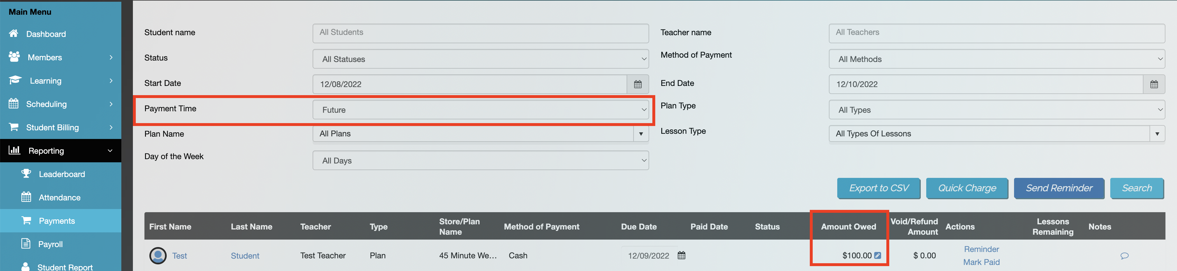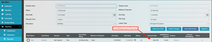 - The payment report will display a balance of $0 for the initial lesson, and the subsequent recurring billing cycle will be the first payment due for the lessons taken: