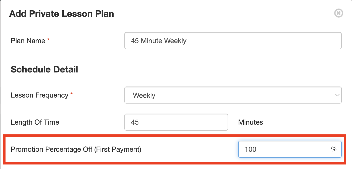 To bill in arrears, it is recommended to set up all plans with a 100% discount on the first payment. This means that the first actual payment will be made after the lessons have been taken. This billing method can be applied to monthly, package, and semester billing, using the lesson count between specific dates.- In the plan builder set the "promotion percentage off (first payment)" to 100%: