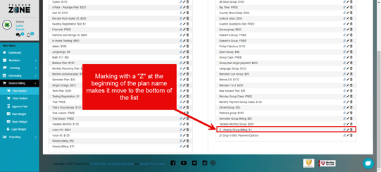 - When this occurs, we recommend NOT deleting any billing plans or classes - simply mark them with a "Z" (this will send it to the bottom of the plans list as it sorts it alphabetically) or "inactive" at the beginning of the names for each corresponding class + plan: