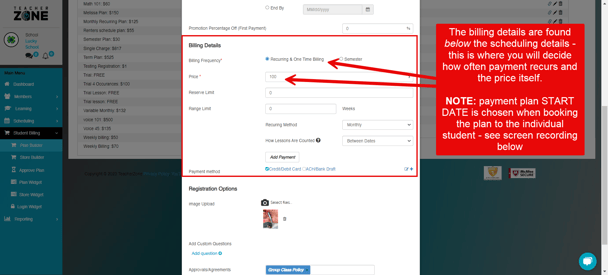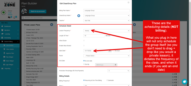 - Once the group plan is built, it will automatically schedule the corresponding class onto the chosen teacher's weekly schedule. Here is how to book students into a group WITH the billing plan attached - this is also where you will decide further billing details such as the payment start/recurring date, payment method, etc: