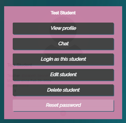 - School and administrator accounts have the ability to reset passwords for subadmins, teachers, parents, and students by accessing and editing their respective records while logged in as an admin or school account.