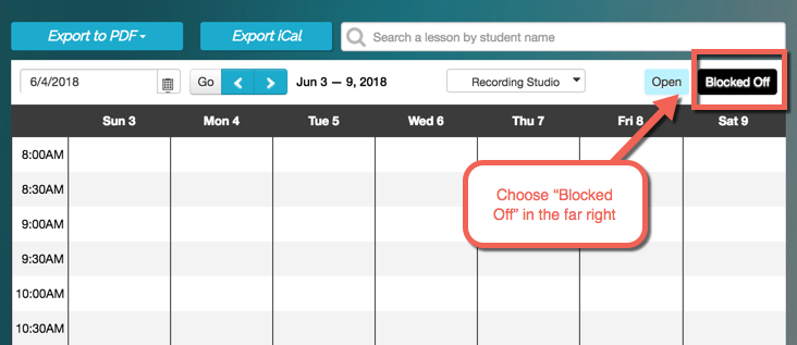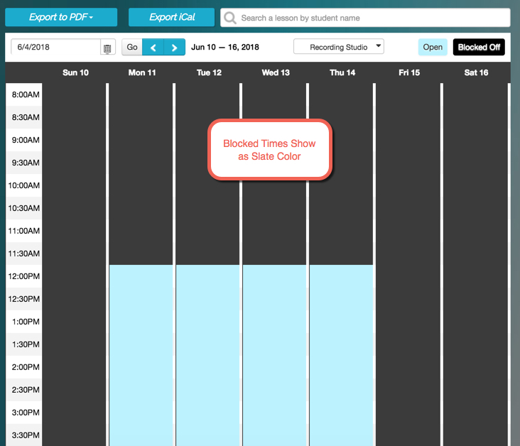 - Your blocked off times, while not a requirement to use our scheduling in the system, are a great visual as to when you or your teachers are NOT available to work and also function to tell the widgets there is definitely no availability. After open times are set, you can fill in the gaps with true blocked off times.