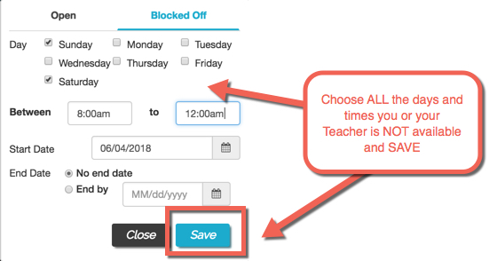 Step 3: Choose the day/s and time/s that you or your teacher is unavailable and save: