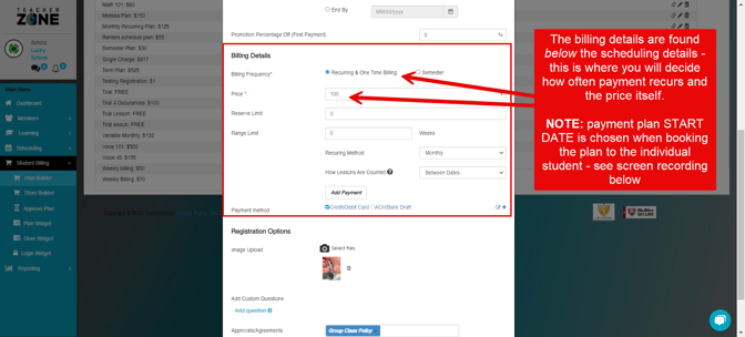 - Once the group plan is built, it will automatically schedule the corresponding class onto the chosen teacher's weekly schedule. Here is how to book students into a group WITH the billing plan attached - this is also where you will decide further billing details such as the payment start/recurring date, payment method, etc: