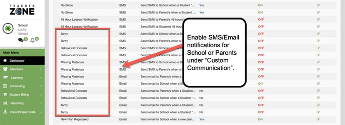 - You can set up custom notifications to automatically send SMS or email alerts when specific notes like "Tardy", "Behavioral Issues", or "Missing Materials" are selected: