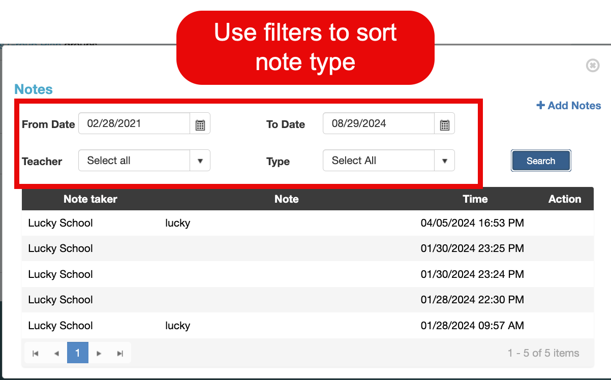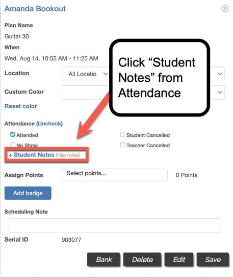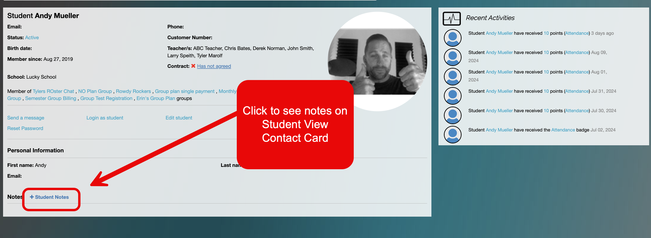- Once a note is created, it is saved under the student's profile as "Student Notes." You can easily access this by clicking on "view" after searching for a student's name or by clicking on their name in the schedule to open their contact card: