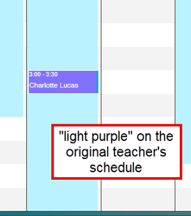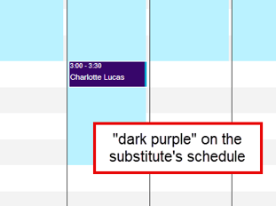 - Once the substitute teacher is assigned, both the original teacher's lesson and the substitute teacher's lesson will be highlighted in purple color (lavender for the original teacher, dark purple for the subtitute teacher). Additionally, a star symbol will be displayed in the top right corner for both teachers, indicating that the lesson has been changed.